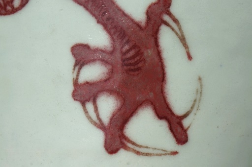 釉里红创烧于元代,盛行于明代洪武朝。因为皇帝姓朱,且成业于“红巾军”,所以特别喜欢红色。但是釉里红的成品率远远比青花低。因为铜离子对温度极为敏感,在窑炉中温度不到,呈现黑红或灰红;火候稍过铜离子便挥发,出现飞红现象或干脆退色。到永乐宣德以后,几乎绝迹。直到清康熙才将这一工艺恢复。