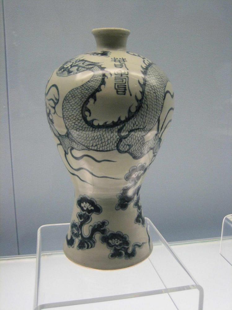 梅瓶被古人称为天下第一器型。洪武釉里红常绘制四季花卉纹,如牡丹、菊花等。此种洪武“春寿”龙纹梅瓶,据曾任首都博物馆馆长的马希桂先生在《中国青花瓷》中考证说,目前馆藏仅有四件记录。其中两件在国外,国内仅存两件。其中,典型器有上海博物馆的青花梅瓶(如上图)肩上有篆书“春寿”二字。另两件“春寿”青花在日本大阪和英国格拉斯哥。