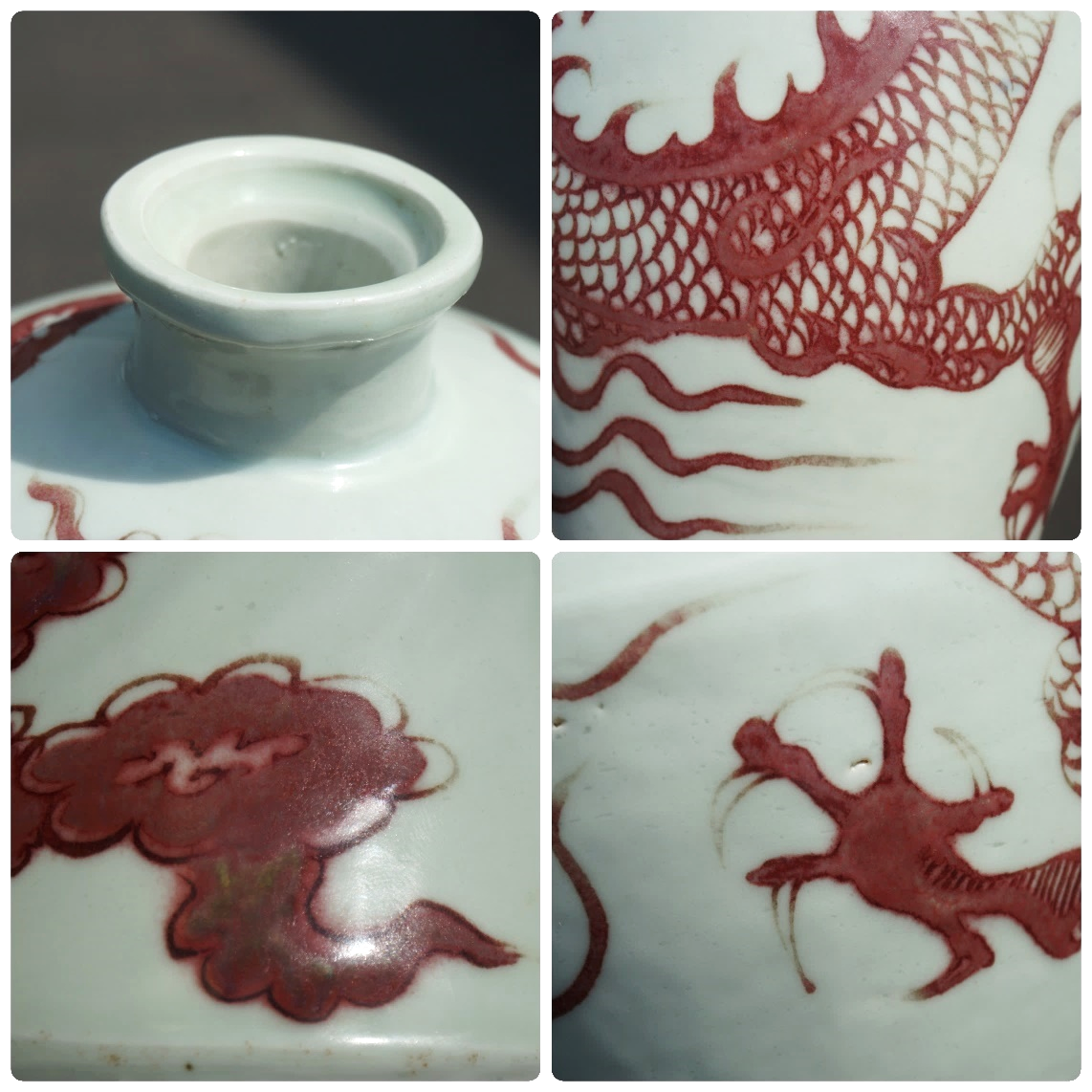 此洪武梅瓶高33厘米,底足直径约13厘米。整体细腰长身,形如美女。瓶为侈口卷唇,丰肩收腹,下部外撇呈凤尾形。釉色闪青,口部有青白色积釉。接胎痕迹可见。器腹主题纹饰绘釉里红五爪云龙纹,洪武时期特色的龙首(俗称猫脸龙,如下图)神态威武,三根肘毛如飘带,龙五爪如镰刀。飞扬于如意纹状的云海之间。