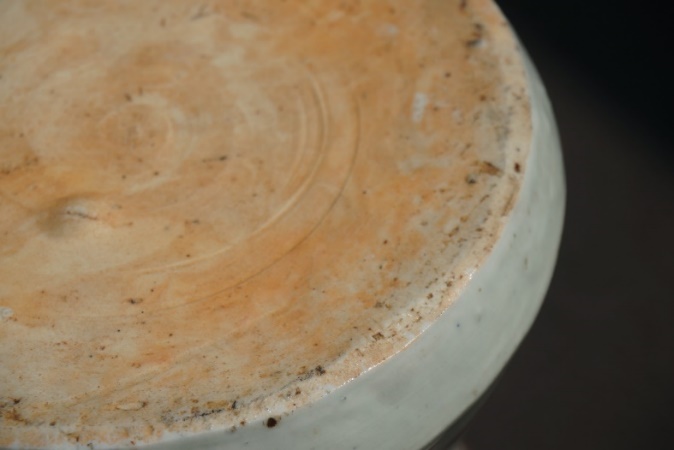 糙底无釉,圈足极浅,有旋削痕和火石红。