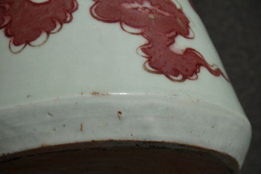 整体釉色晶莹温润,深红色的釉色统一均匀,少有灰褐或者烧飞现象。细节上红釉周围有俗称的晕散和炸料的现象,以及局部有铜绿。底足接胎后呈现为内折的、高约2厘米的倒梯形,十分罕见。应该目的为降低器物重心,所以可能更倾向于祝寿赏赐后摆设,而不是实用型酒器。