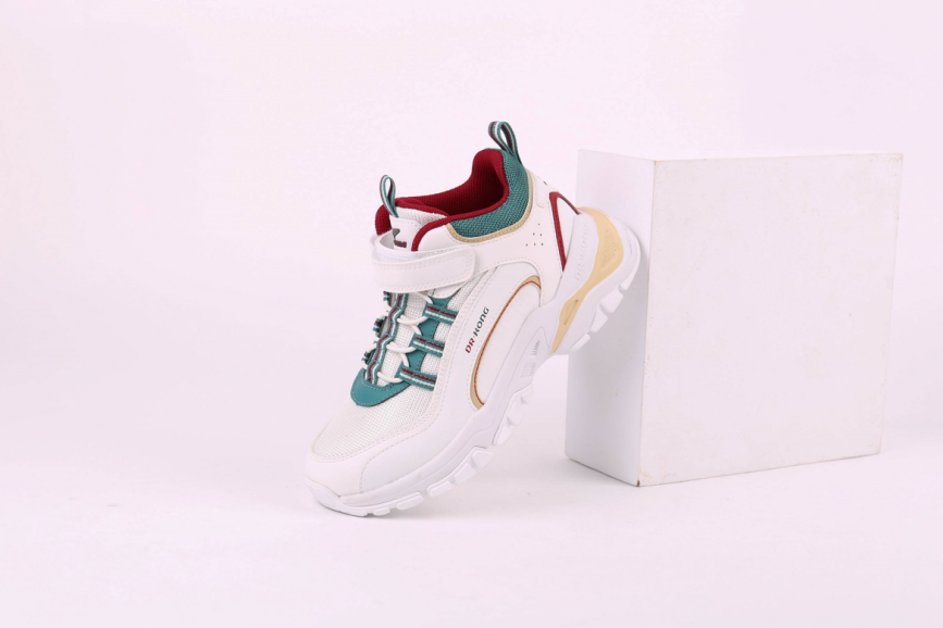 学步鞋方面,江博士这款采用红色与绿色交错的手法,视觉上看起来层次更加丰富。鞋面采用超纤+局部网布材料,极大提升了儿童鞋的舒适透气性能。鞋底不再是单调的大厚底,而是采用黑色色块进行切割,同时配以英文字母KIDS,增加了运动动感。