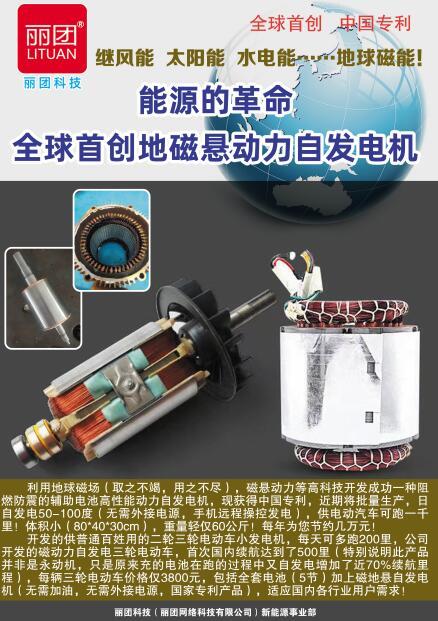 丽团科技开发的磁悬动力自发电机日前获得国家专利!磁动力的应用使我国新能源电动自行车/二轮/三轮摩托车以及小轿车不加油,自发电,可持久续航(非永动机,只是每天可增加续航200---500里程)。这是世界革命性技术,它的核心技术就是利用轮毂制造了一个结构特殊,性能高超,能量转化率达百分之七十以上的盘式永磁电动机兼有电动和发电两种功能,通过改变和控制磁的方向、把永磁动力转换为旋转不停的动能,车子动起来后由于惯性和物体运动产生的动能切割磁力线发电.产生电能并储存。